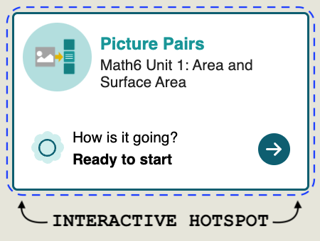 - Frequently navigated areas have large hotspots that are often much larger than the graphical area on screen. For example, in the following image, a student who is trying to press the forward arrow button can click anywhere within the blue dotted lines to start this activity. (When using keyboard tab order navigation the entire tile will come into focus.)